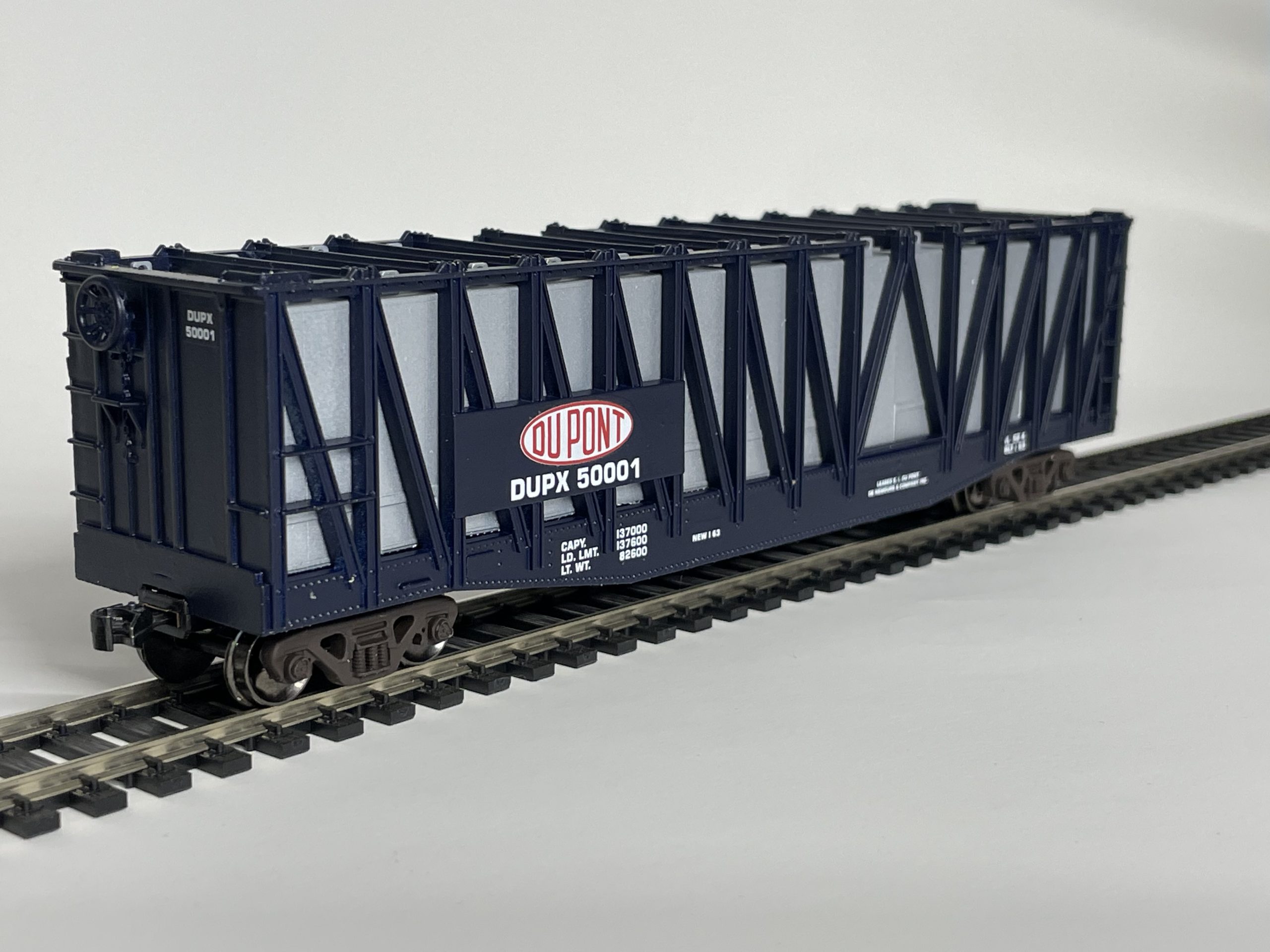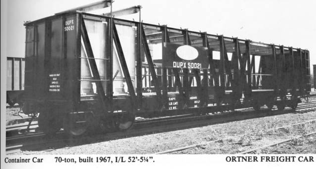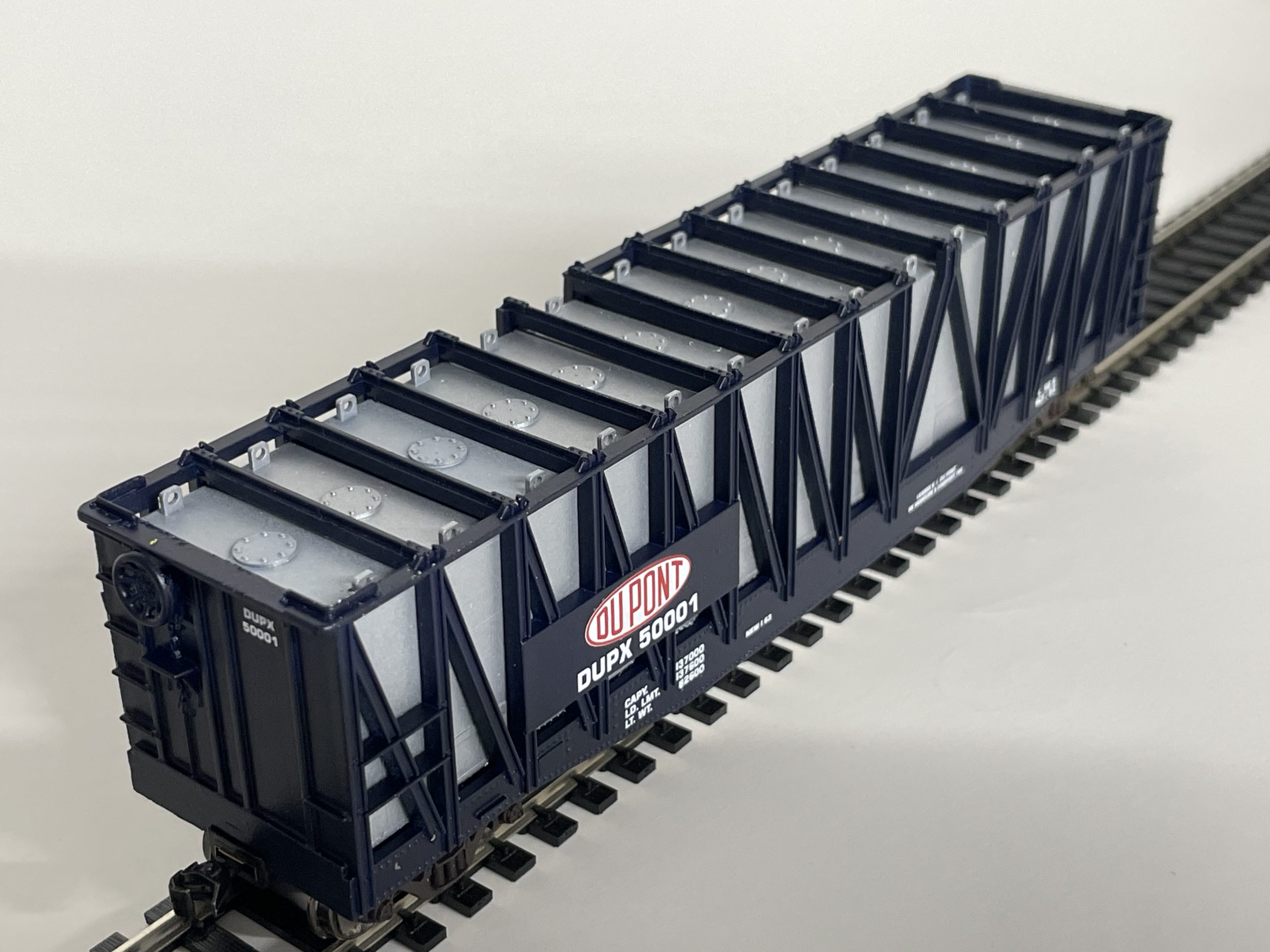 Larger calcium carbide containers were used starting around 1963. These were also used for dry chemical transport. DuPont Chemical had 20 special cars built to carry these larger containers, and AHM made the early version of these cars (AHM 5393) (DUPX50000-50003). Although AHM labeled the cars as several roads and companies, only DuPont had these cars. The AHM car isn’t 100% correct, but it’s close. Later, bulkhead flats were used to carry these, with special crossbars and turnbuckle type tie downs.