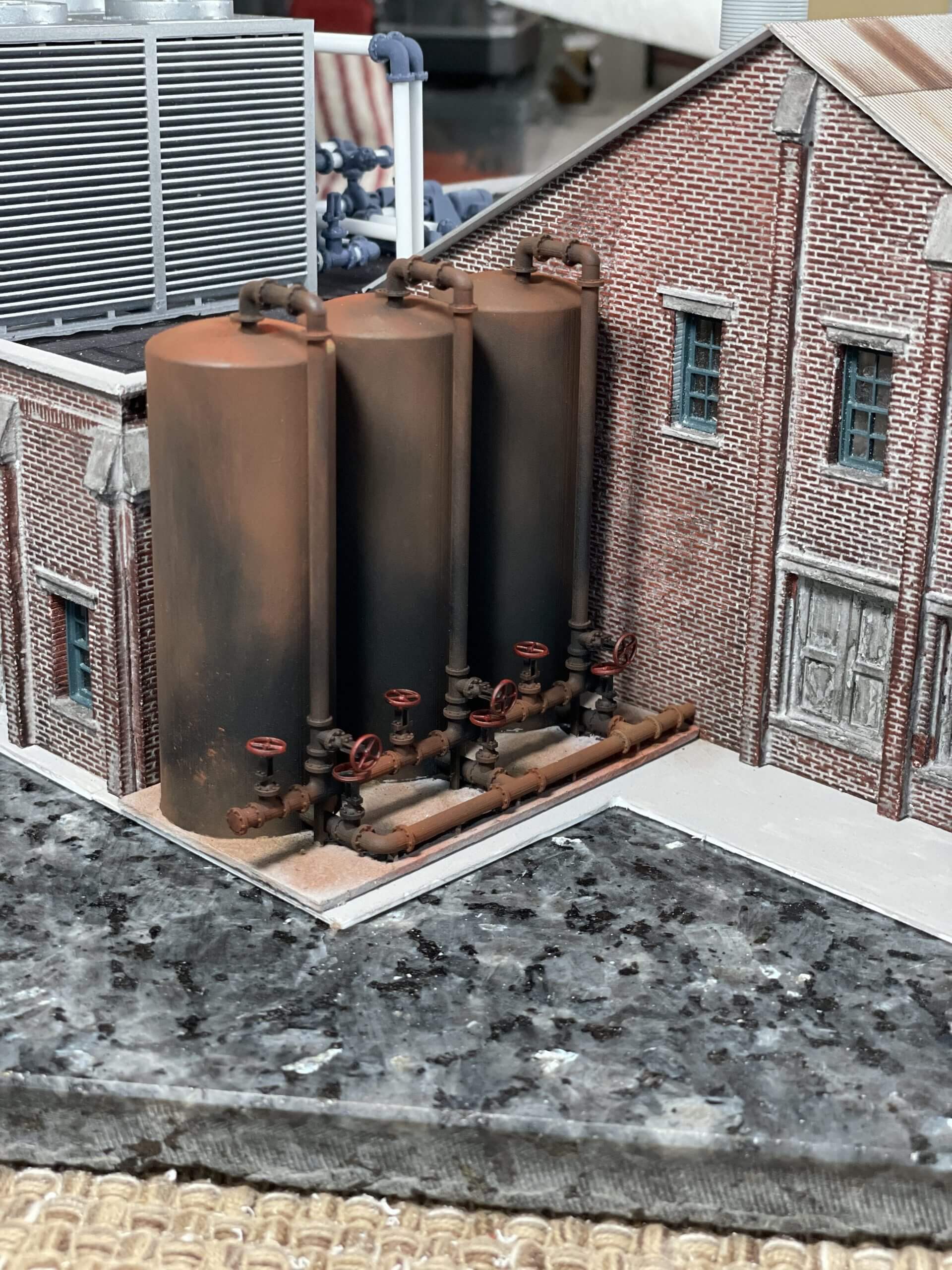 Upgrade your factory, locomotive service, fertilizer plant, and just about any other industrial scene with this 3 Tank Storage Facility. A great way to add an exterior detail. (use 3/32 Evergreen Tubing to expand the scene or run plumbing to the fittings.