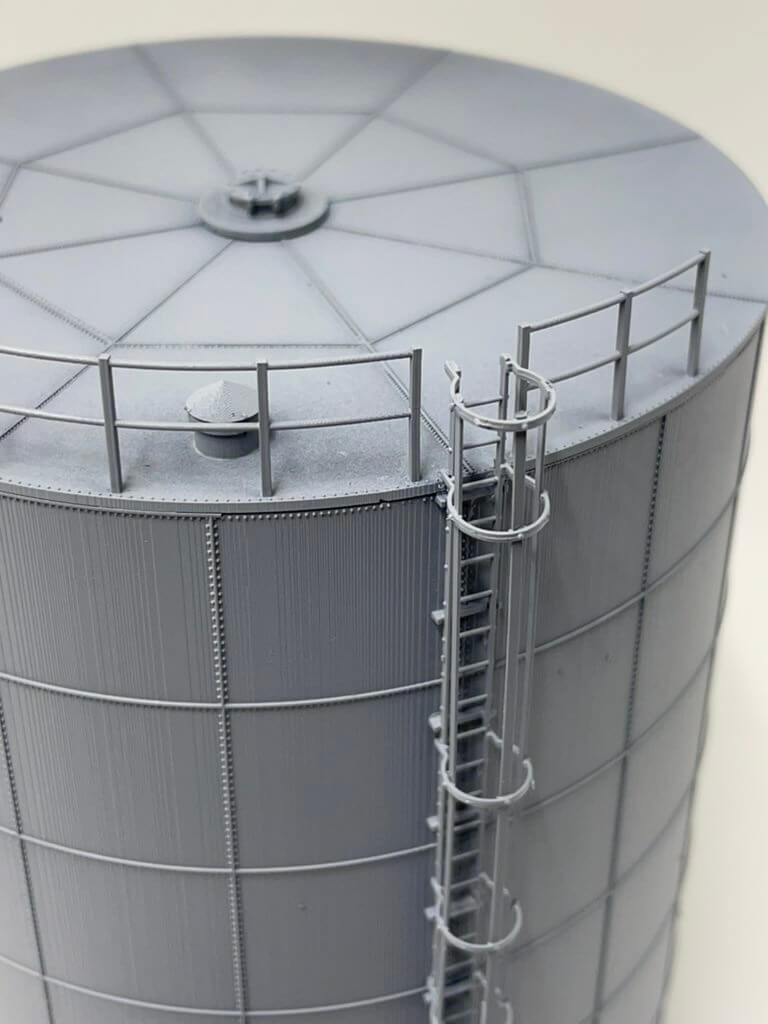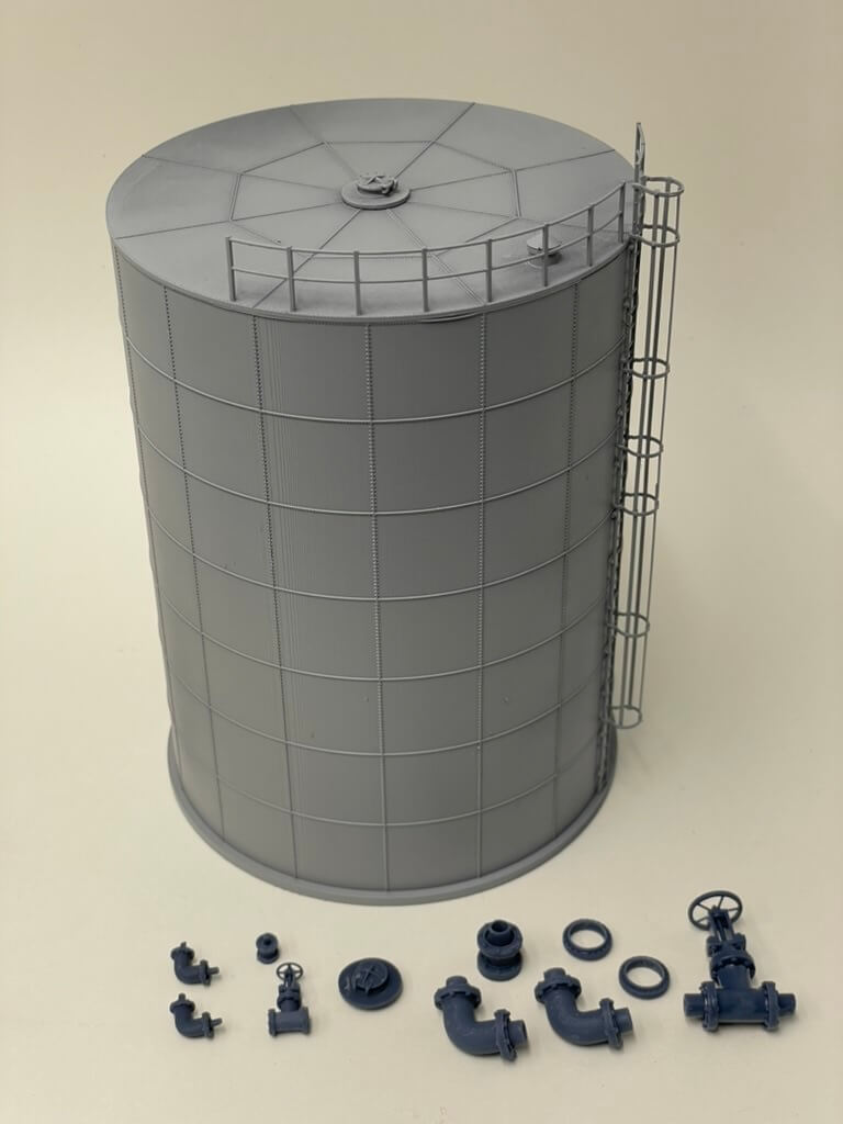 HO Scale 130,000 Gal. Tank: 4 1/2″ x 5 7/8″ tall.