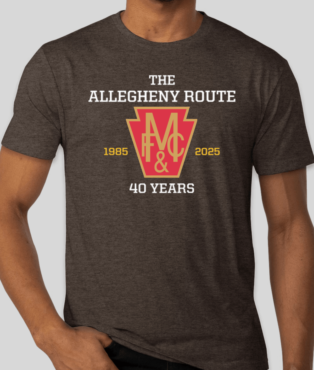 High quality Tri-Blend Tee, fits snug across chest and arms, and loose around waist. Look your best and help celebrate 40 years of the Allegheny Route!