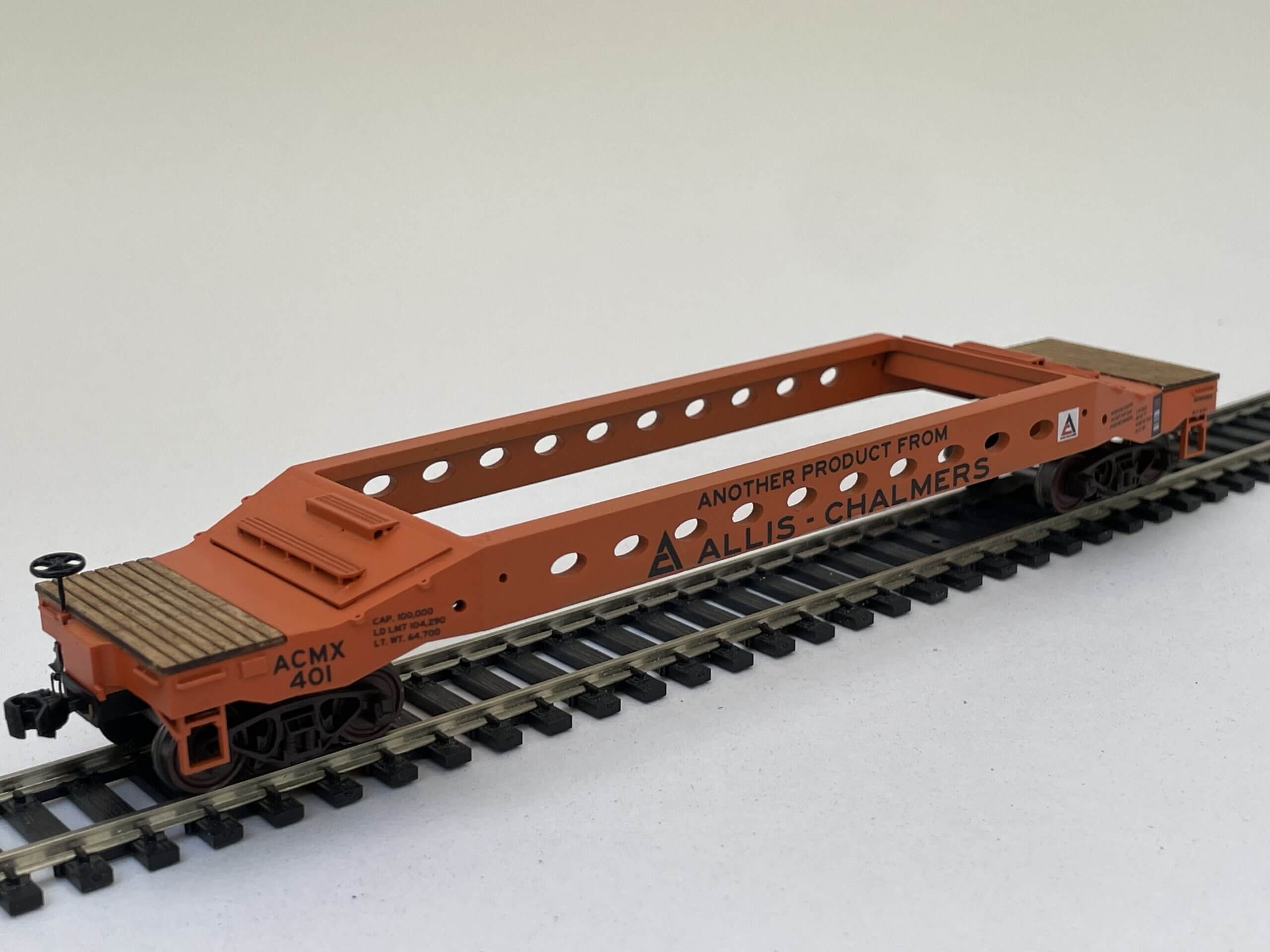 Allis-Chalmers built two of these cars, originally for transporting heat exchangers for then new Nuclear Power plants in 1958. The cars remained in service hauling many oddly shaped loads AC would produce in their West Allis, WI plant until the mid 1980’s. An exact scrap date is unknown but it believed to be some time in the late 1980’s or early 90’s.