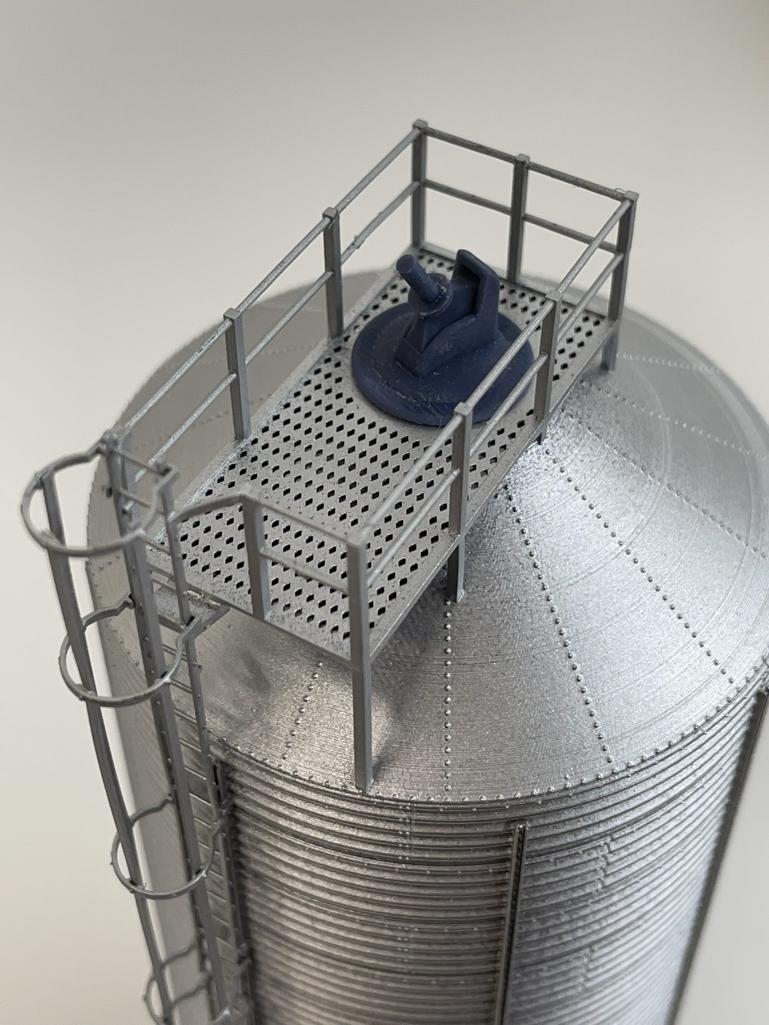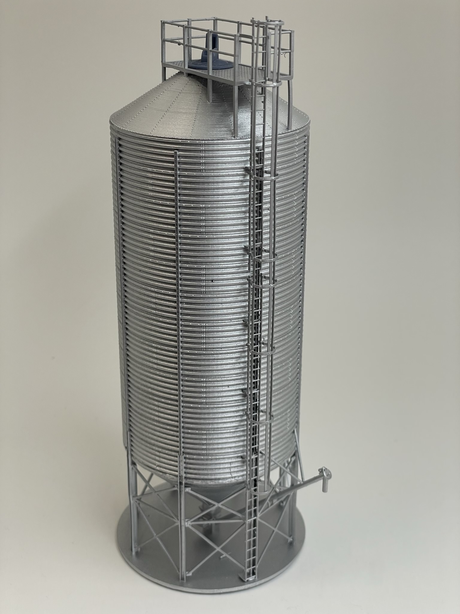This Butler Wet or Dry bin is a much needed accessory for the line side elevator. Standing at 50′ to the top of the bin (6.750″ tall), this wet or dry bin is much more manageable than the Walthers Bin for small town elevators or larger farms. Printed in one piece with concrete pad, top is separate.