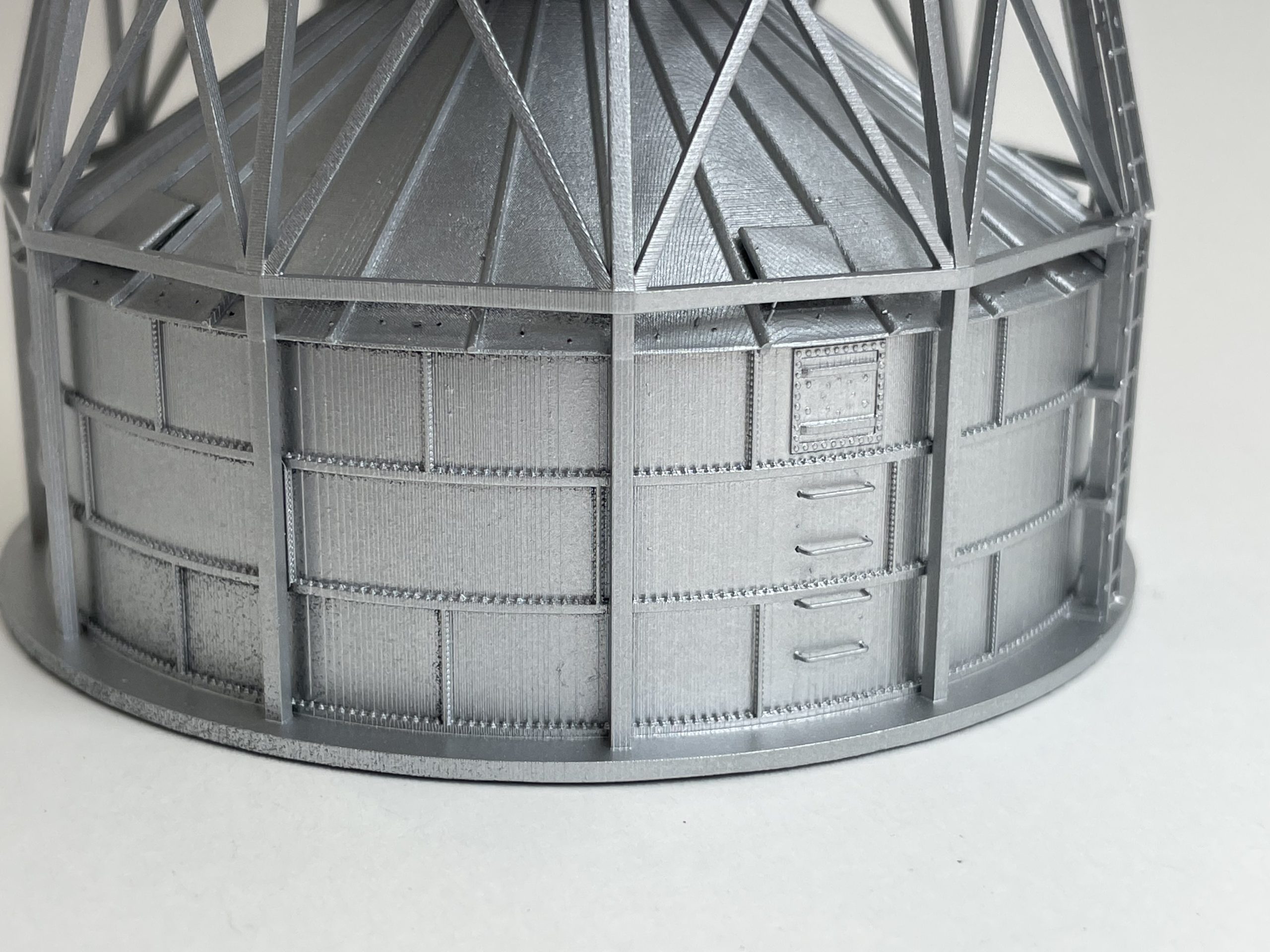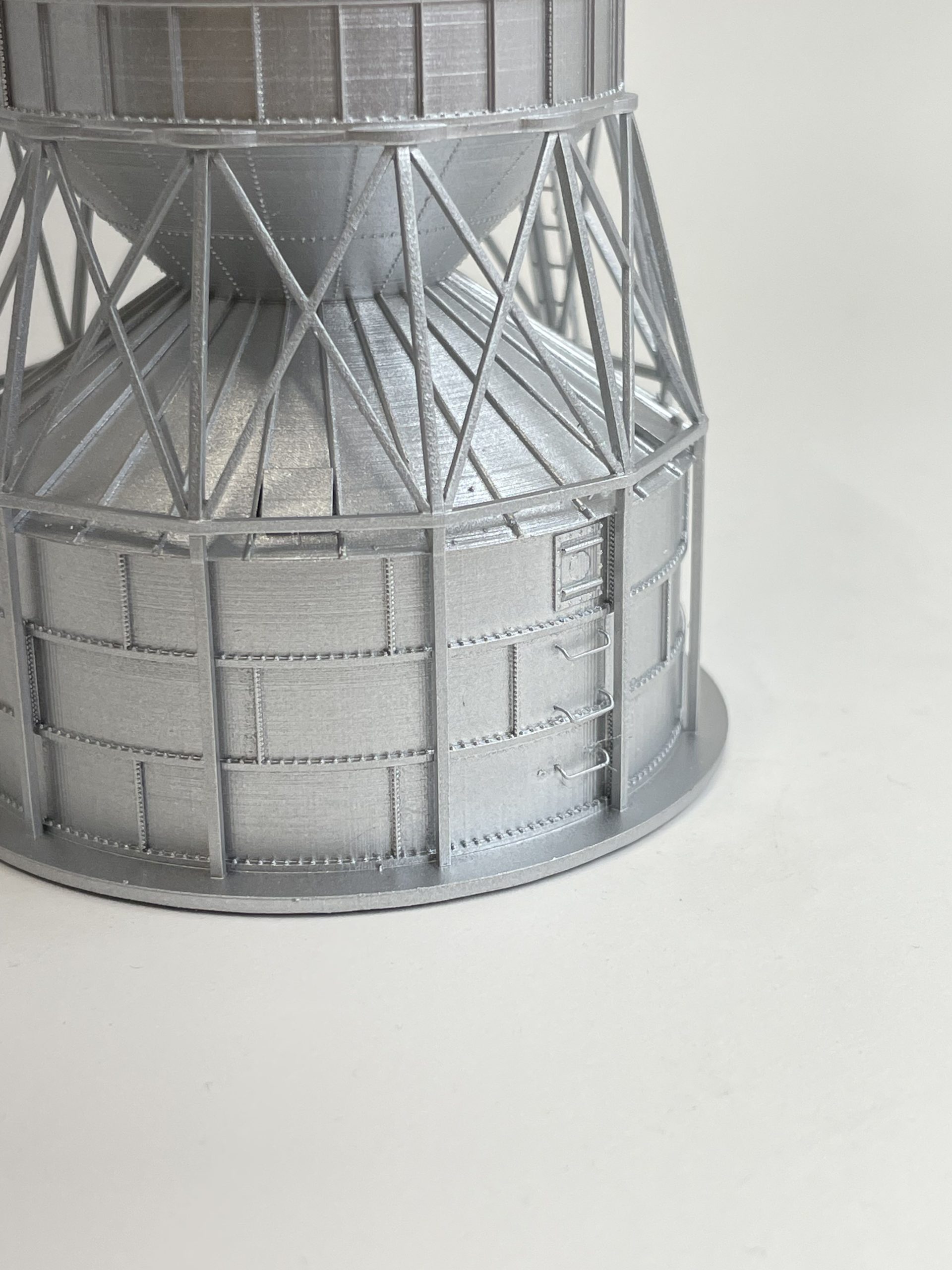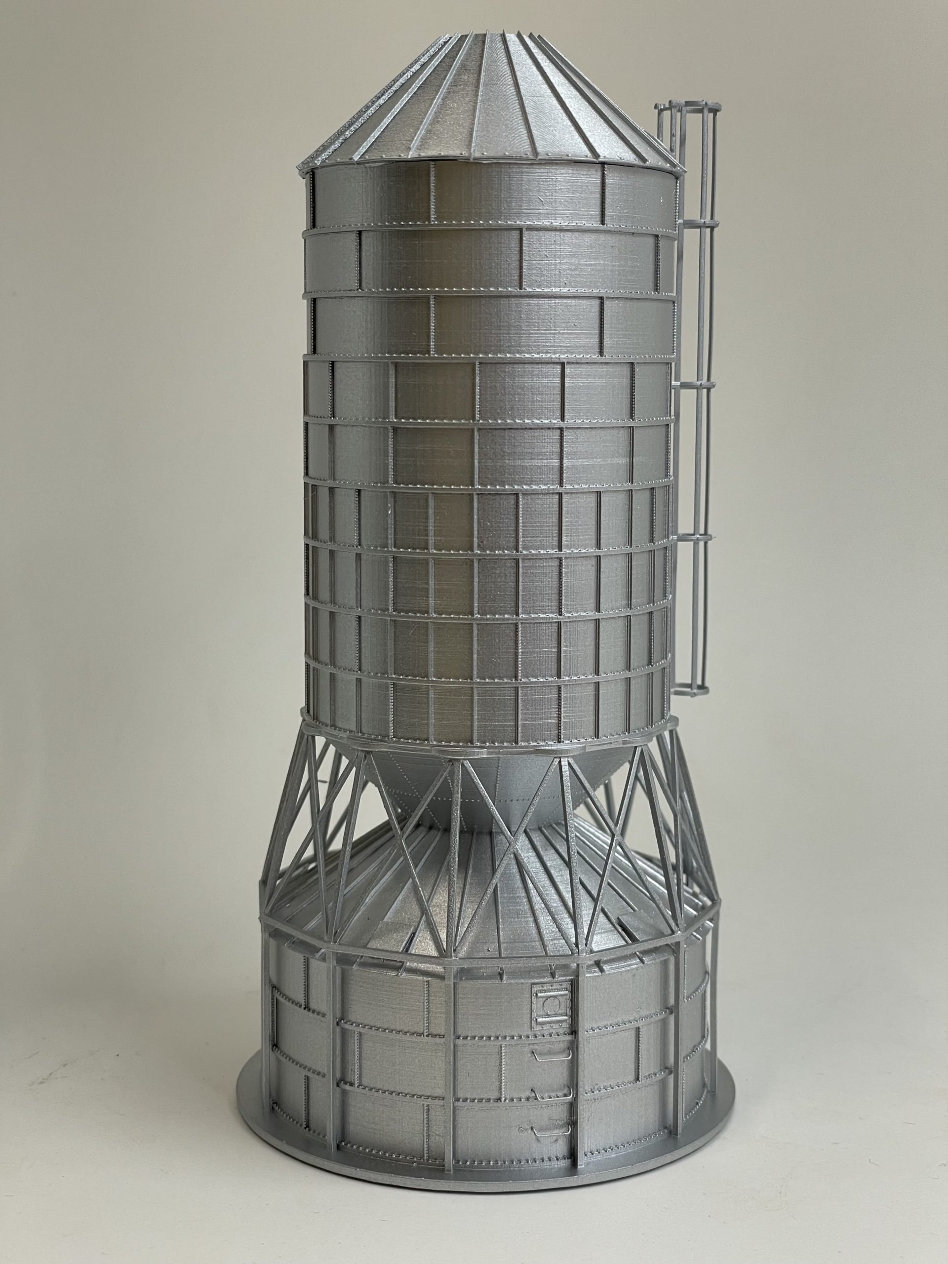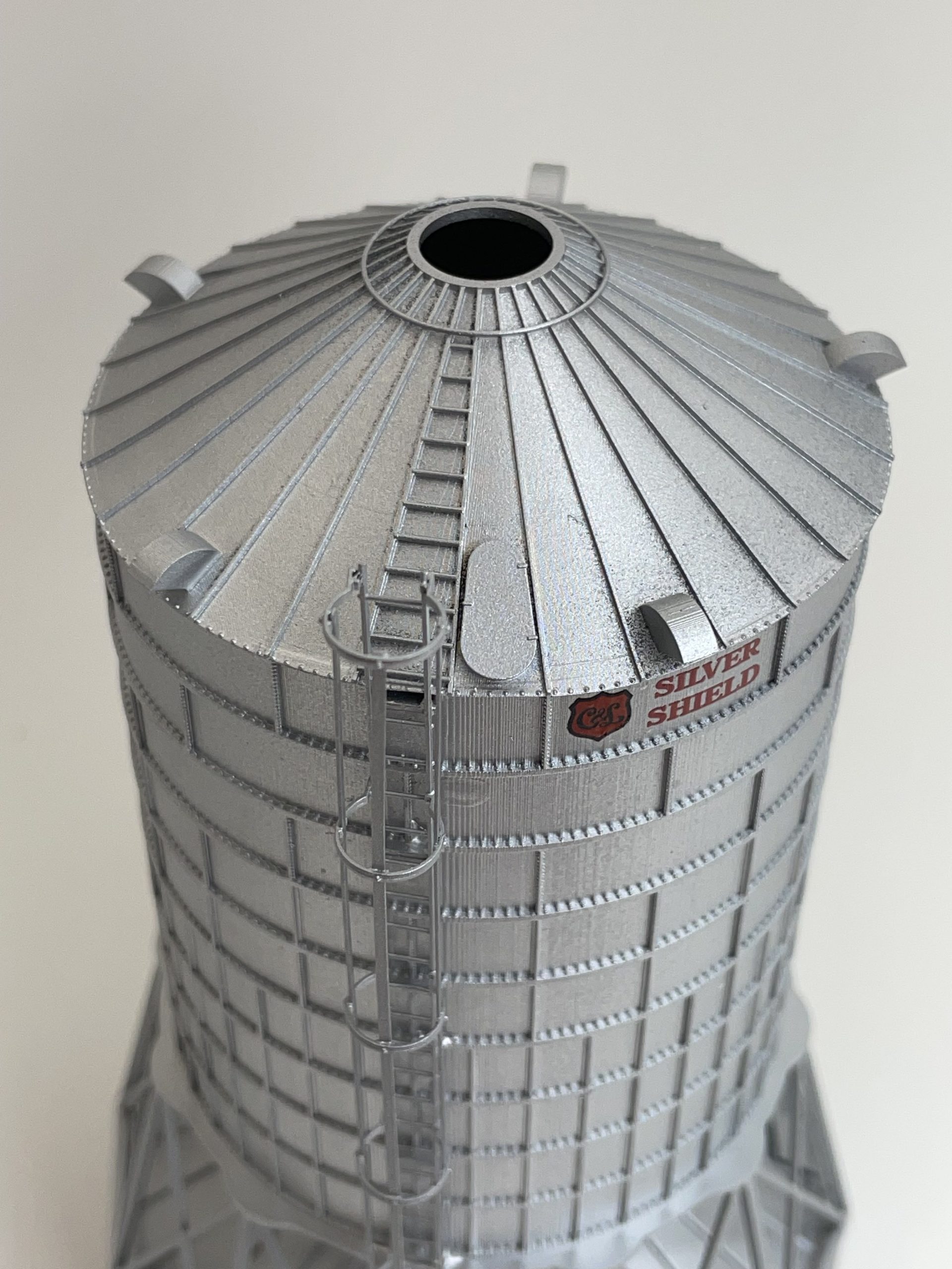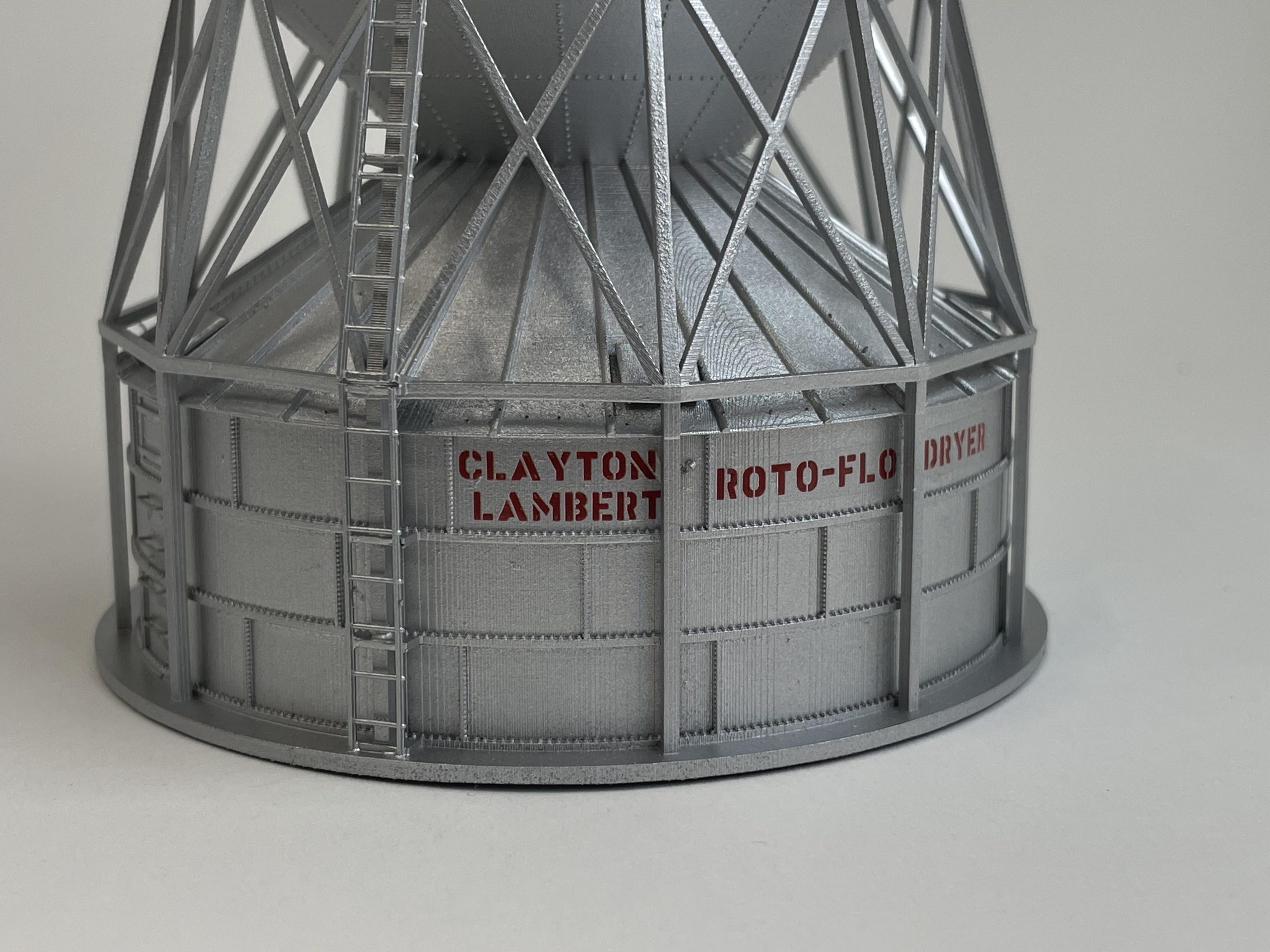 Clayton & Lambert Wet Bin mounted on a Roto-Flo Dryer. This was designed as a space saver for elevators where real estate was sparse. A great addition to that small town elevator on your layout with the same real estate problem. Designed from the prototype, our model has brackets for Tichy Train Group 8003 Caged Ladders, and Tichy Train Group 18″ grab irons. Includes bin adapter for use with 1/8″ Evergreen Tubing. This model is a 15′ diameter wet bin, and a 19′ diameter Roto-Flo.