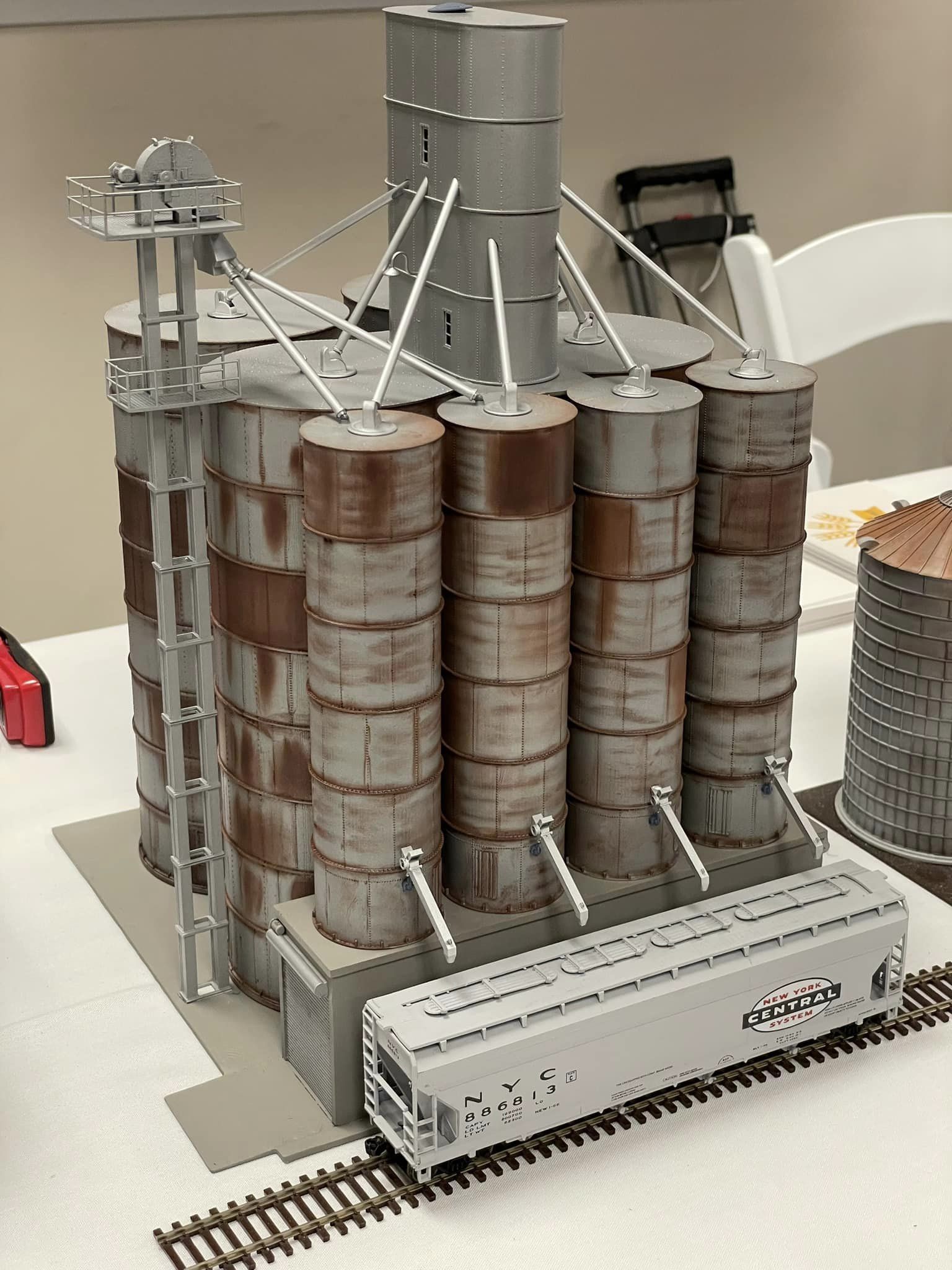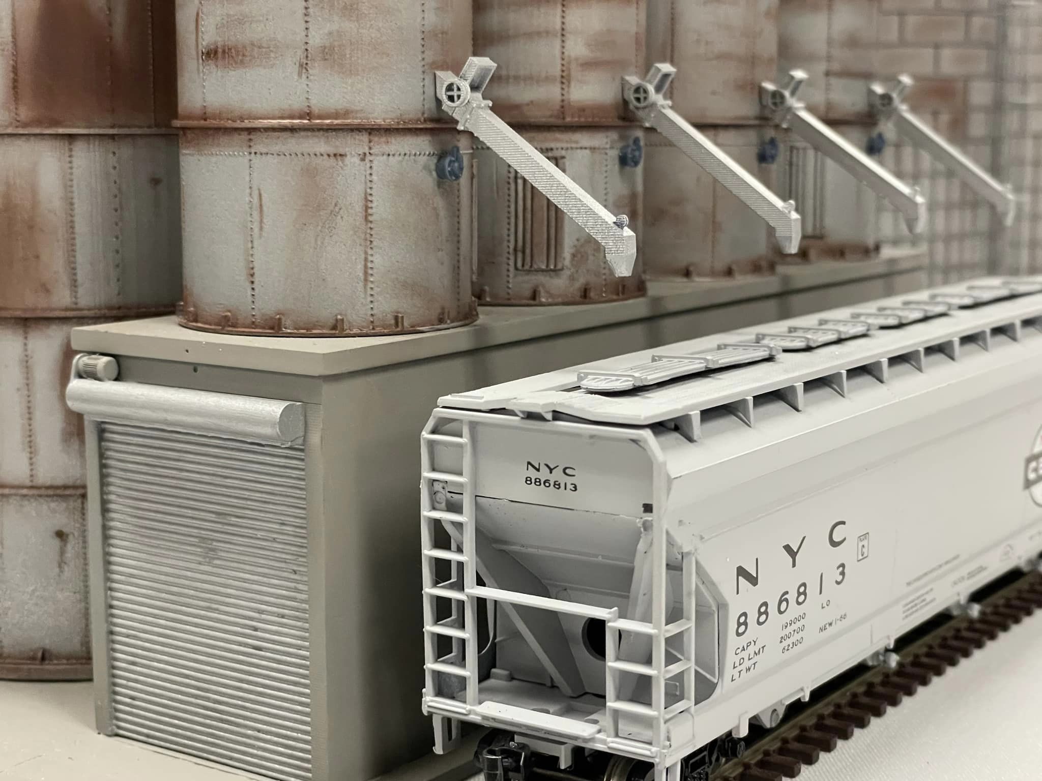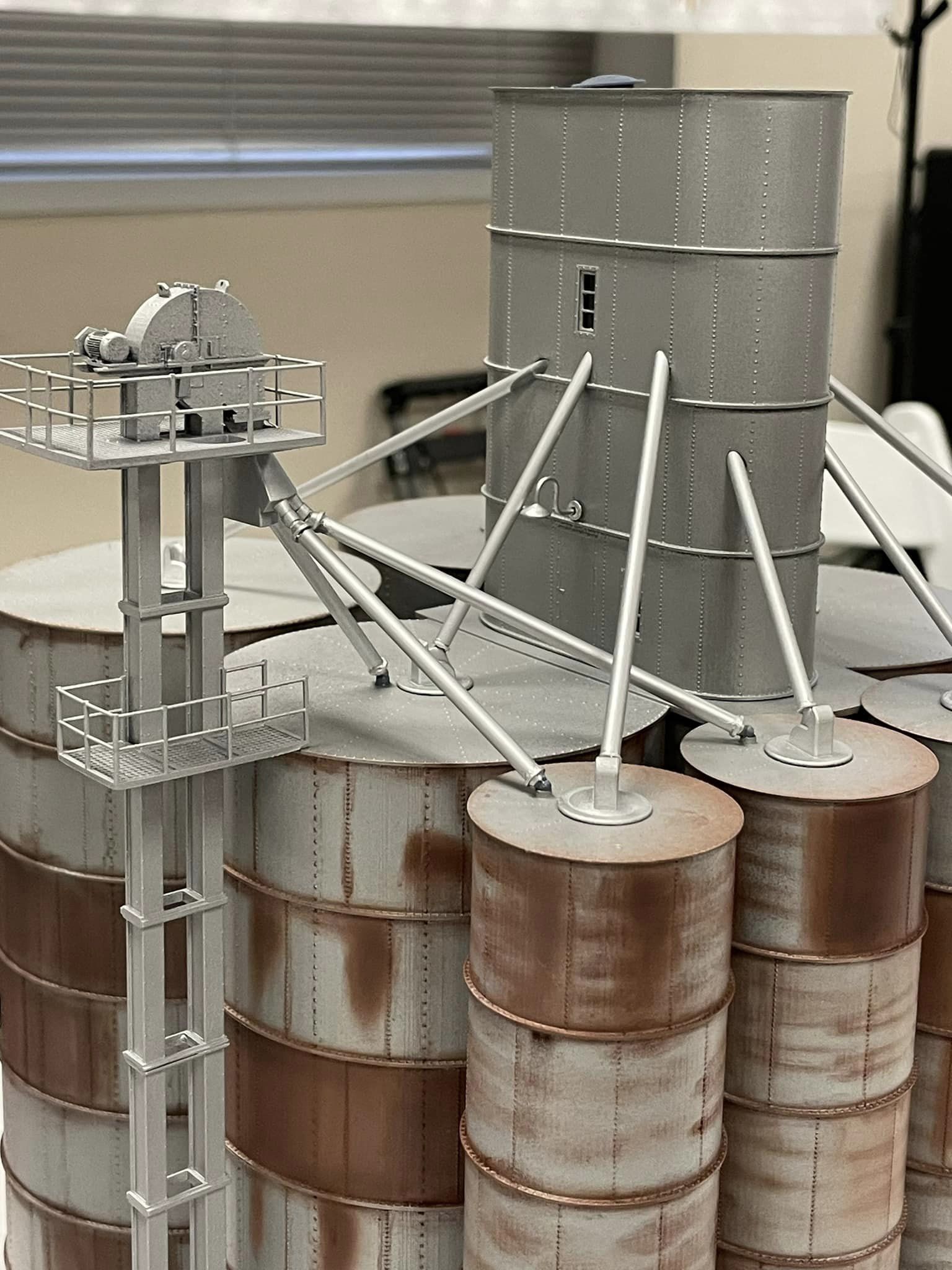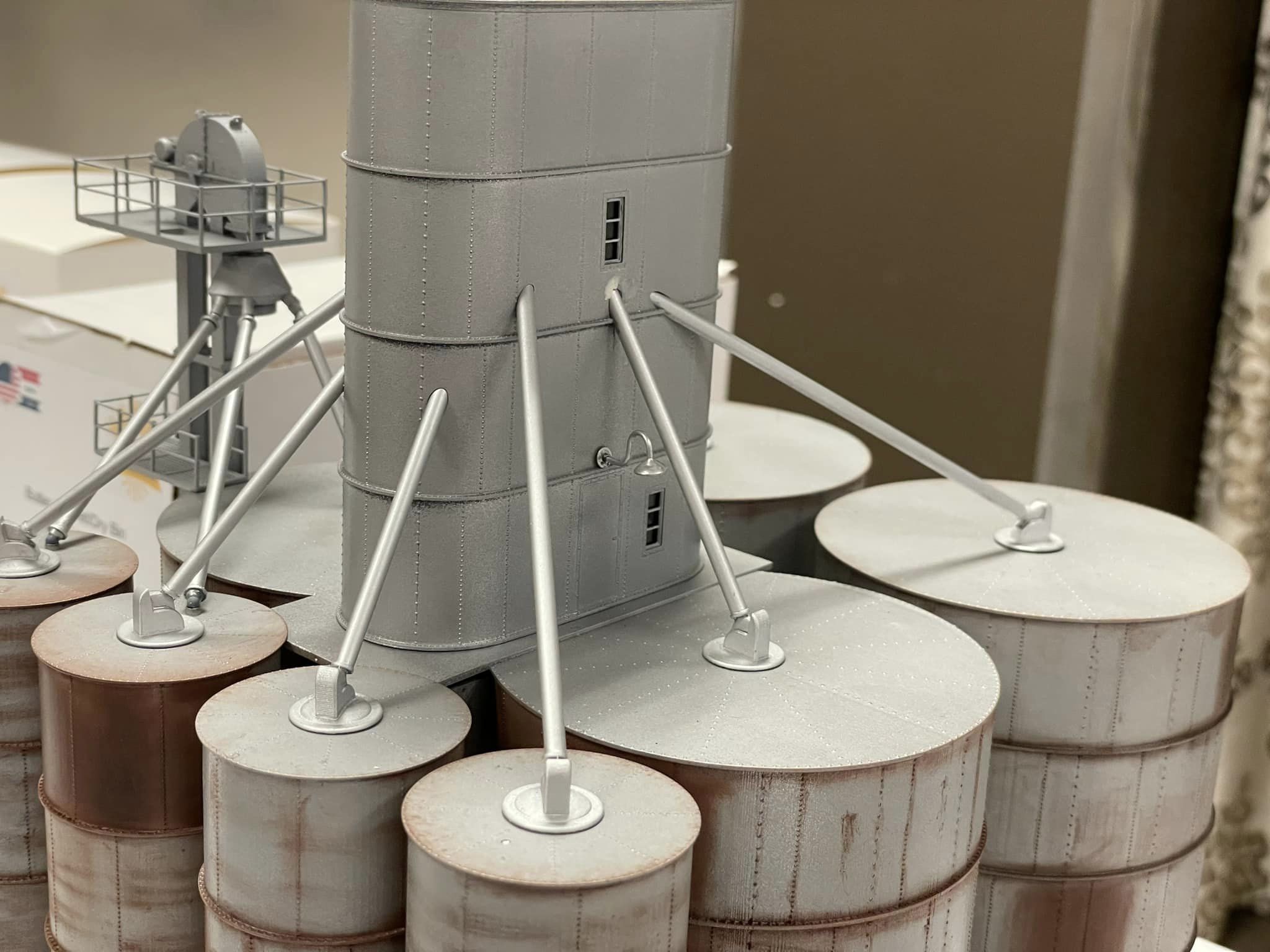 This no so unique elevator is located in Perry KS. Manufactured by Columbian Steel Tank, this prefab design allowed a company to prescribe what they needed, and Columbian could simply select the appropriate parts from the catalog and ship them to the site.  Our kit comes with everything you see in the photographs minus paint and weathering. Two lamps are provided for exterior mounting on the head house, and one for interior light if the modeler should desire it.  Tichy windows with glazing and platforms are also provided. ACC cement is recommended, and final fit and finishing of the components is required of the modeler. Please use the accompanying photos as reference for weathering, painting and assembly. It is recommended that all parts be dressed and test fitted, then painted and weathered before assembly.