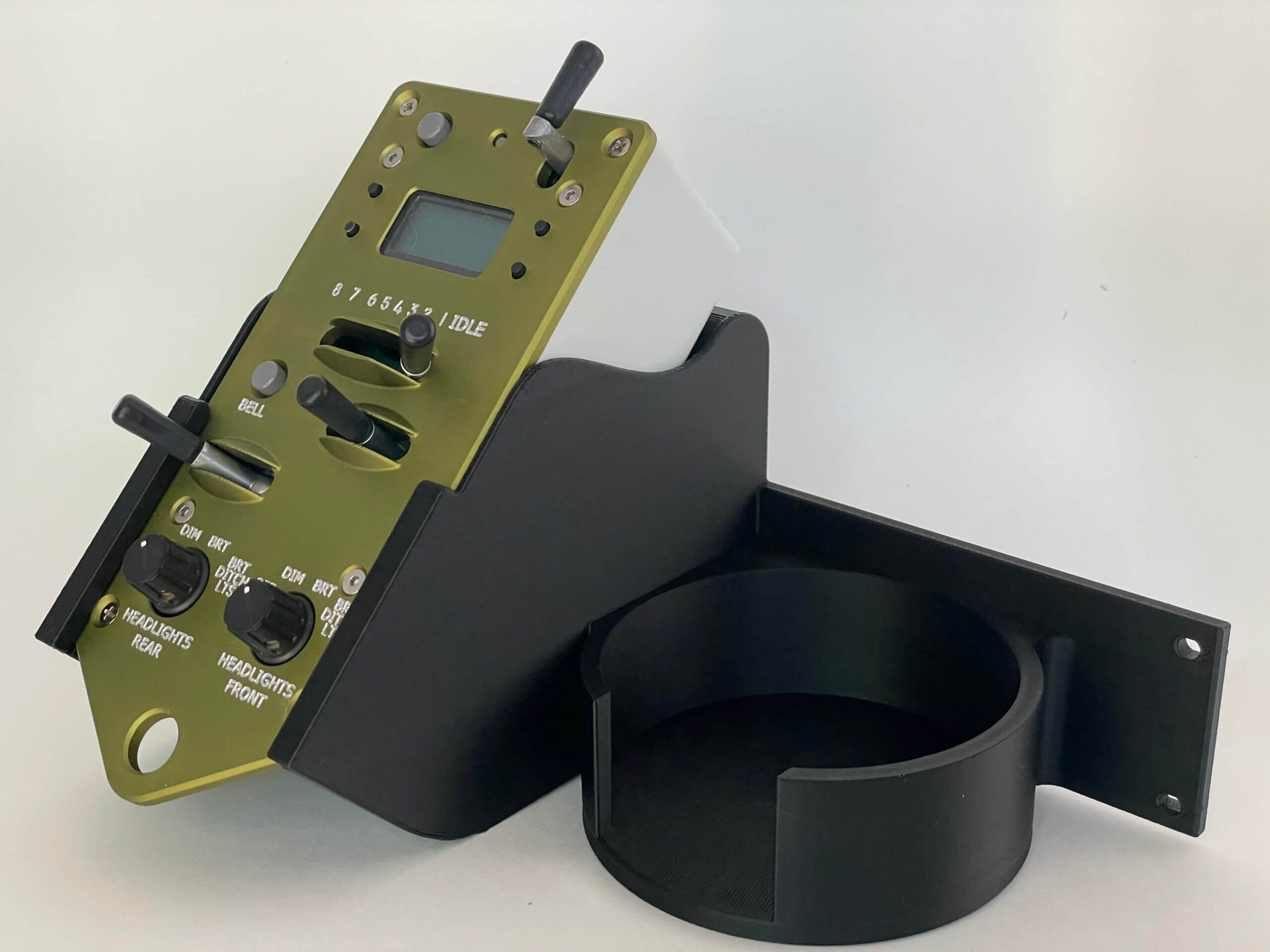 Operator throttle holder has pick stick holder, 45° throttle holder, and cup / beverage holder. The angle makes easy viewing of the screen, and also not having to hold the throttle while performing switching operations or when you have a crew. Makes one handed throttle operation a snap. Great for industries or small yard locations.