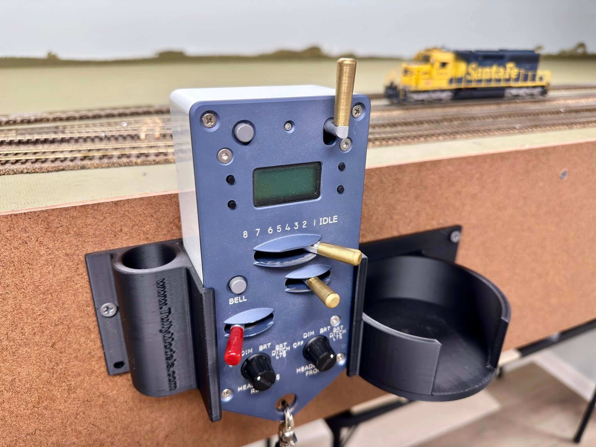 A long needed solution to holding your ISE Protothrottle securely on the fascia, with a spot to hold pick sticks for uncoupling, and a handy cup or beverage holder to keep folks for absentmindedly placing their beverage on your scenery or trackwork.