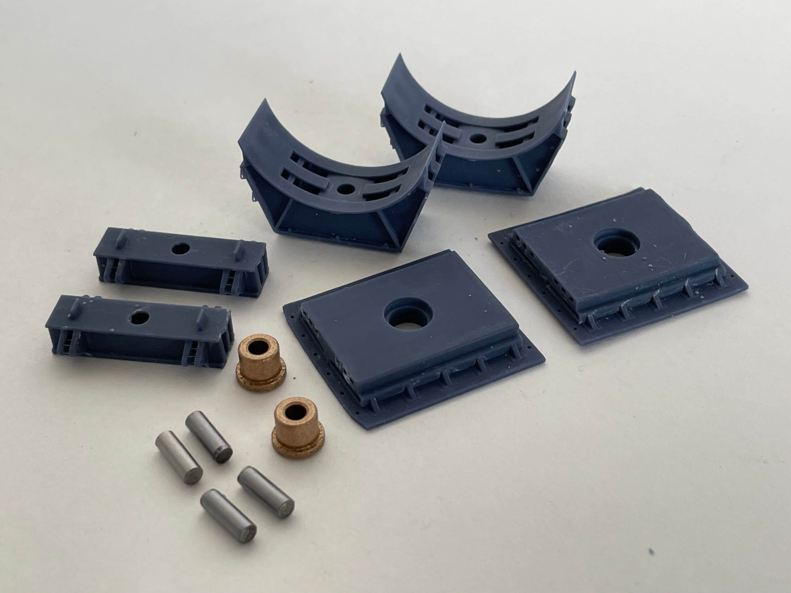 Set includes 2x Load Bolster Plates for flat car deck, 2x Bronze Bearings, 4x Stainless Dowel Pins, 2x Cradle Load Bolsters (1″ Dia.) , and 2x Flat Load Bolsters.