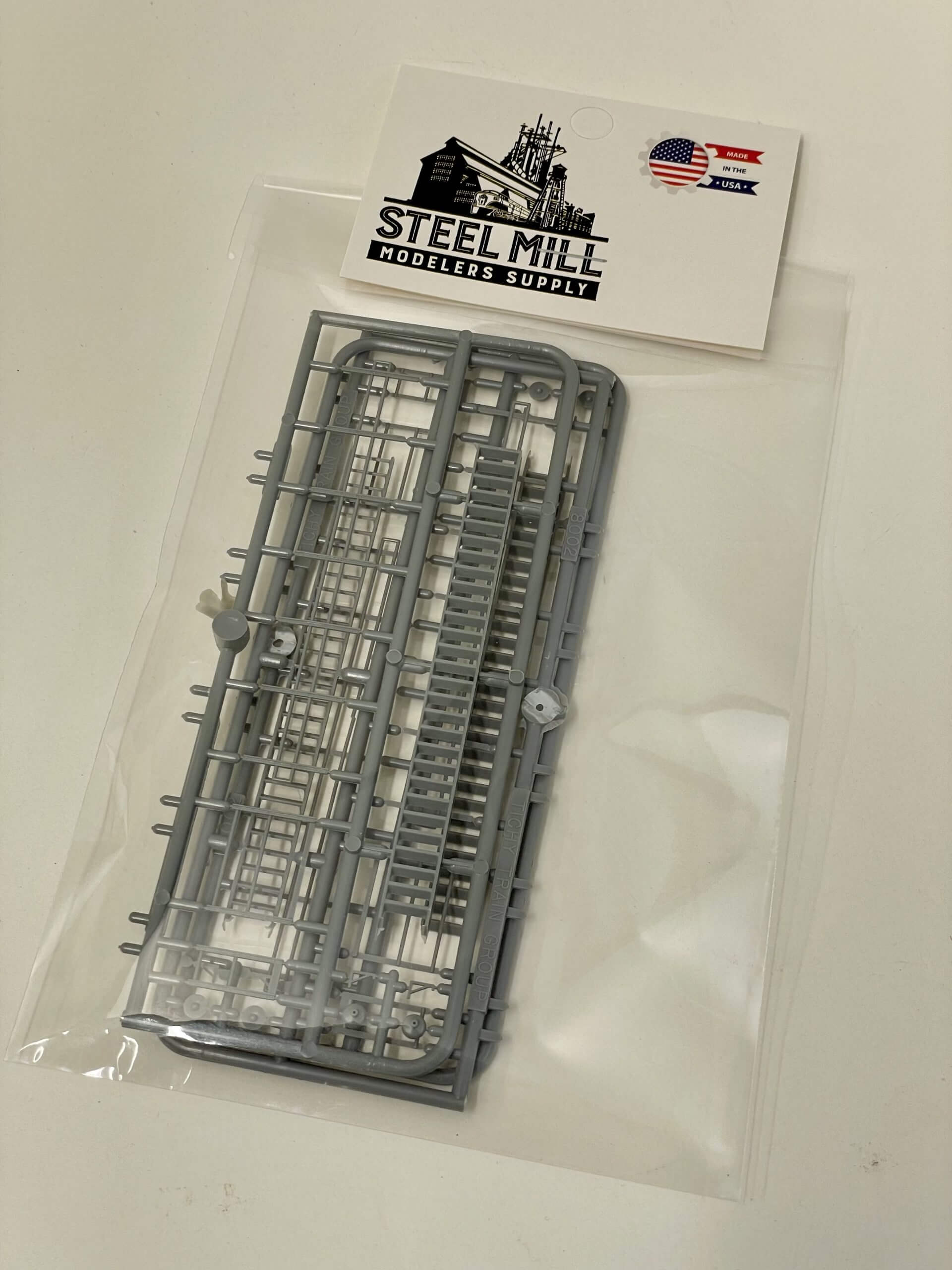 Package of 3 stairs with railings. Length of stair stringer 3.25″. Injection molded styrene in grey.
