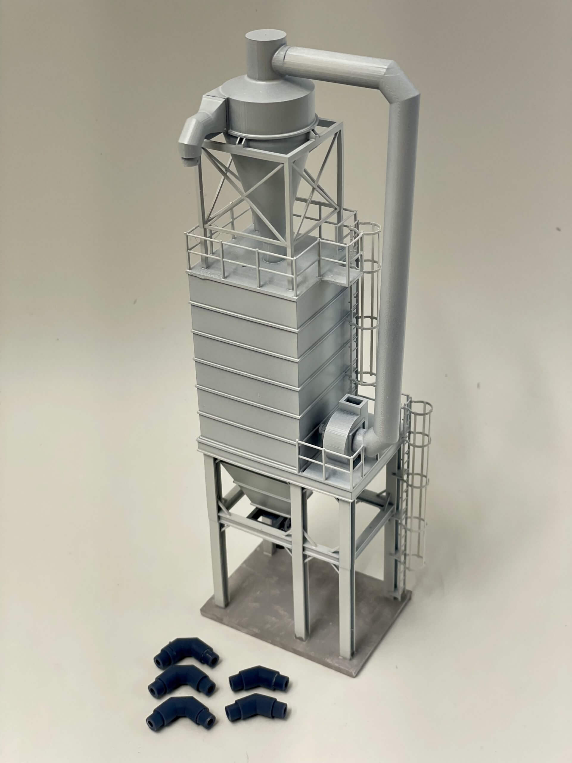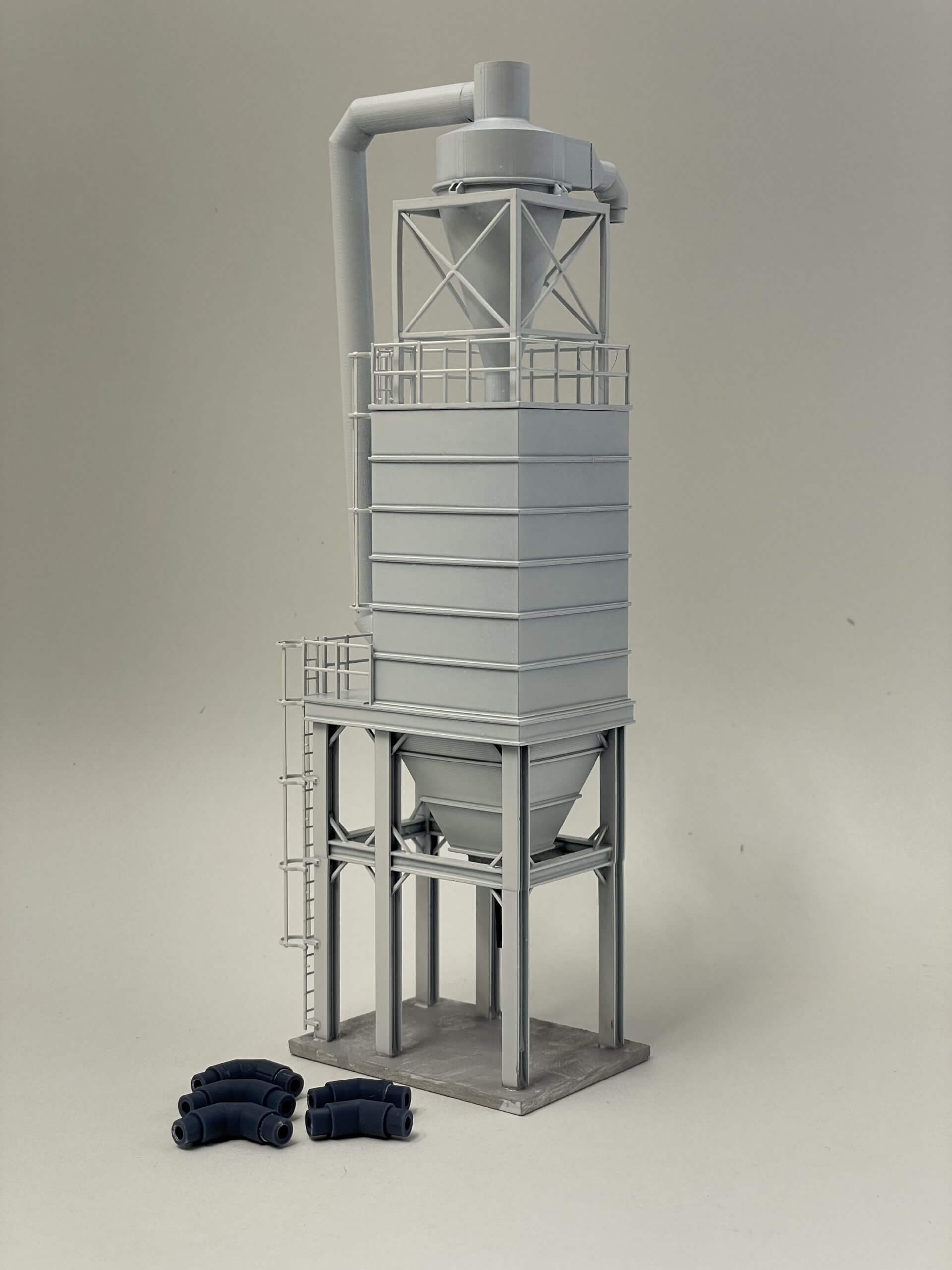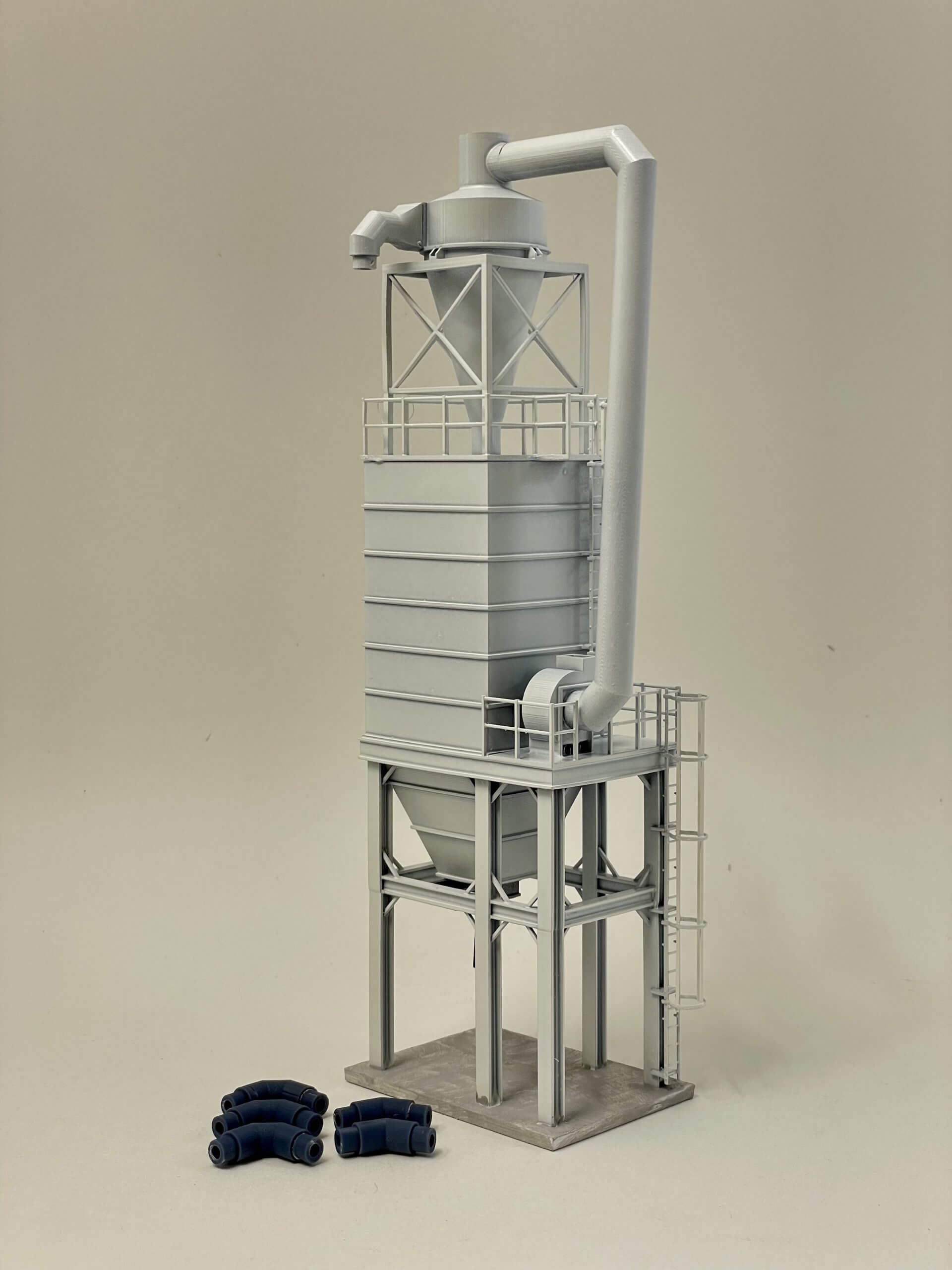 Looking for a Nuisance Dust Collector for your large elevator or terminal, we have you covered! the set includes everything you need to plumb the suction duct from your unloading or loading shed. Model consists of base, cyclone, bottom gate and rubber chute, blower duct, 1/4 adapter, 2x 45° 1/4″ elbows, 3x 90° elbows, 2x 1/4″ x 7″ Evergreen tubing, 2x Tichy Caged Ladder kit. Paint and modeling skill not included. Our prototype is located in Burlington, CO.