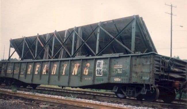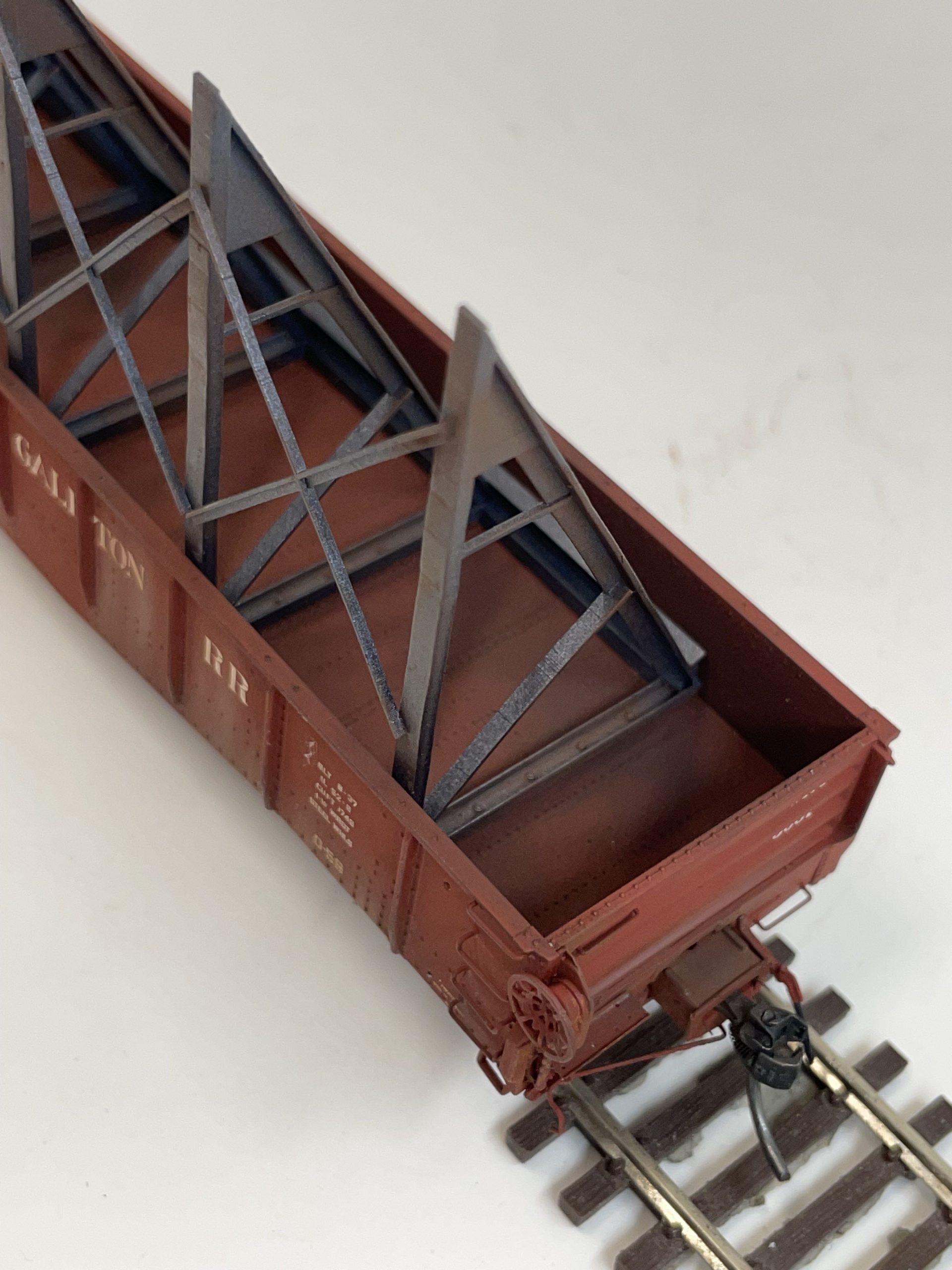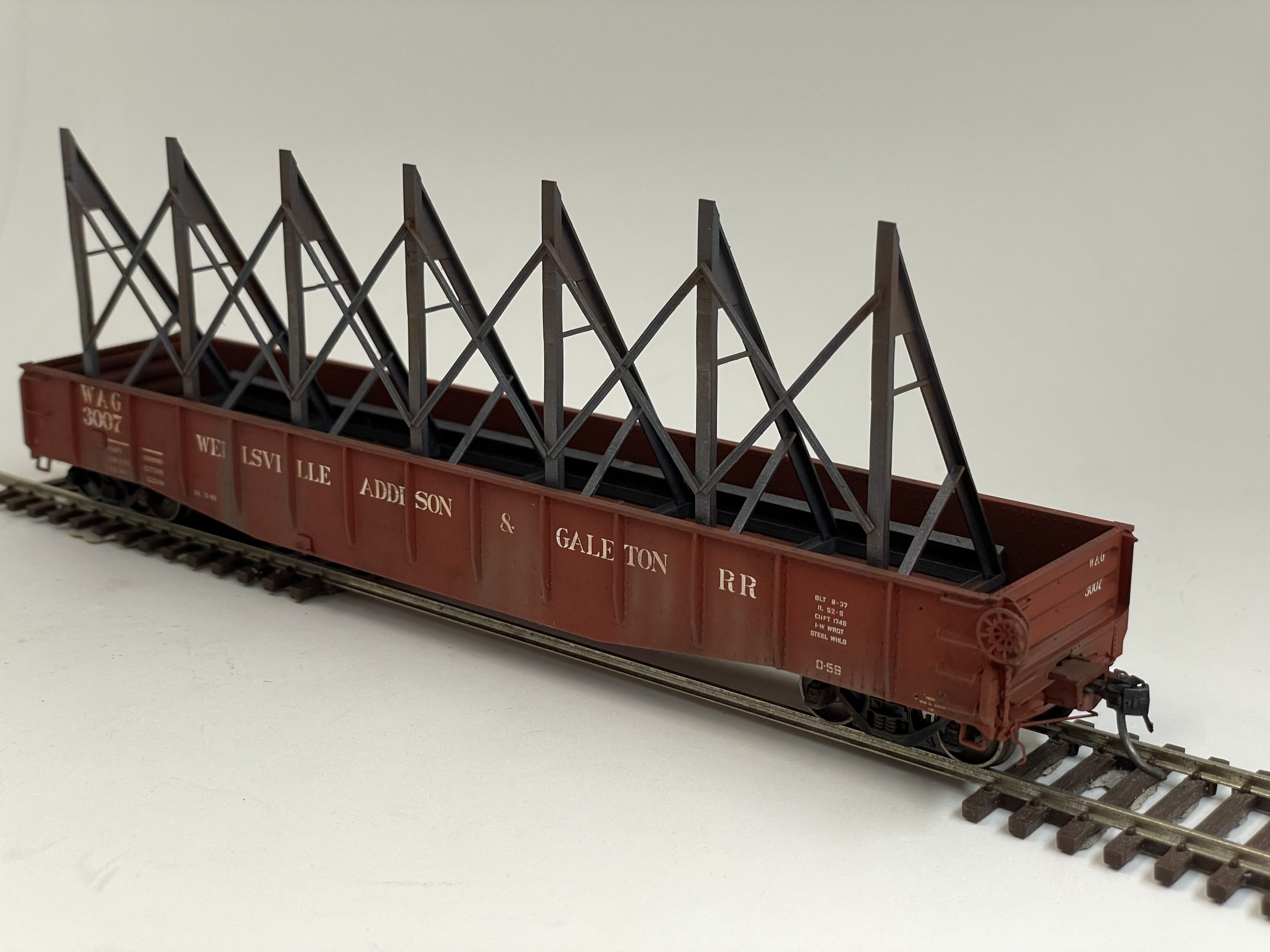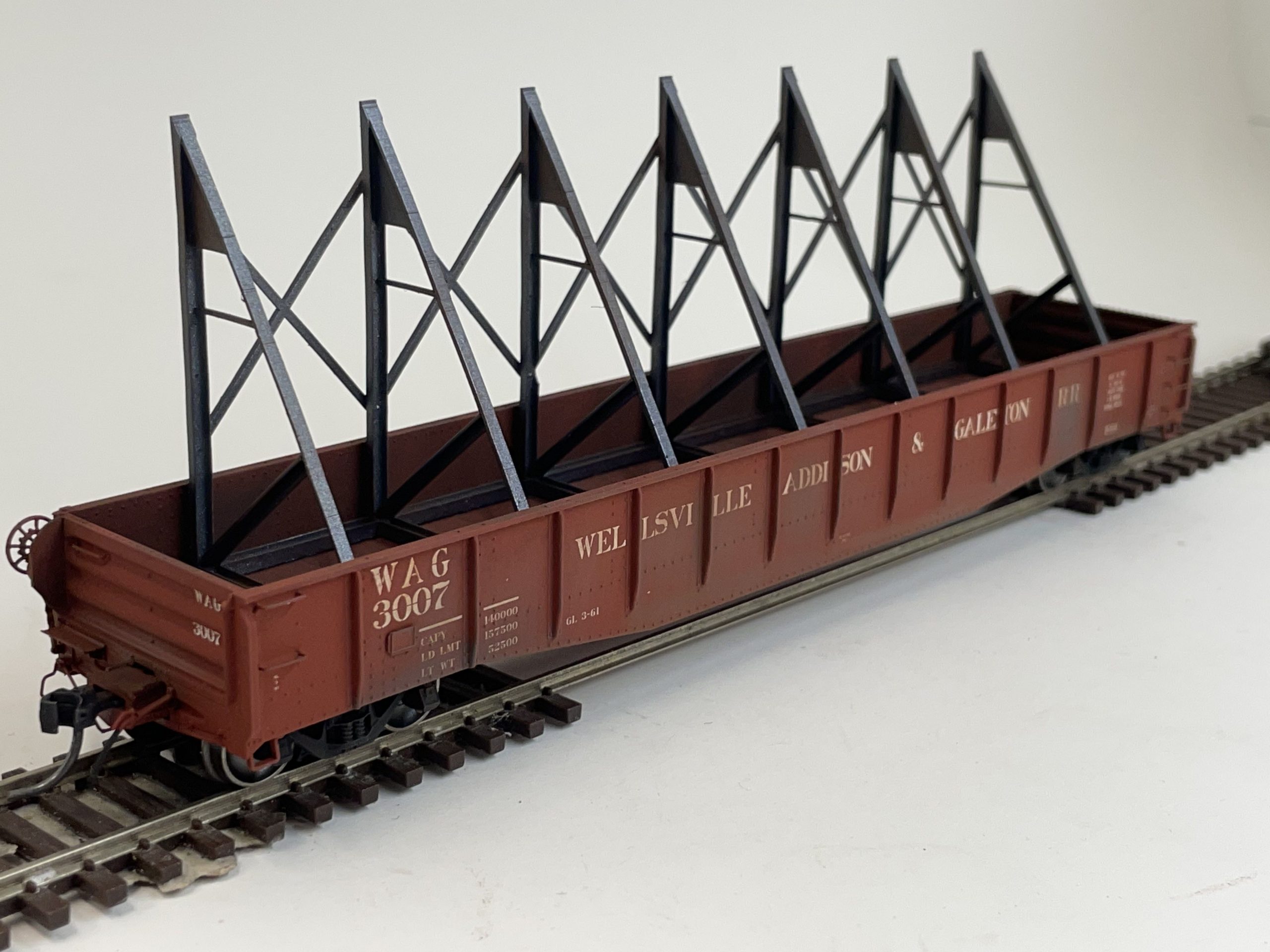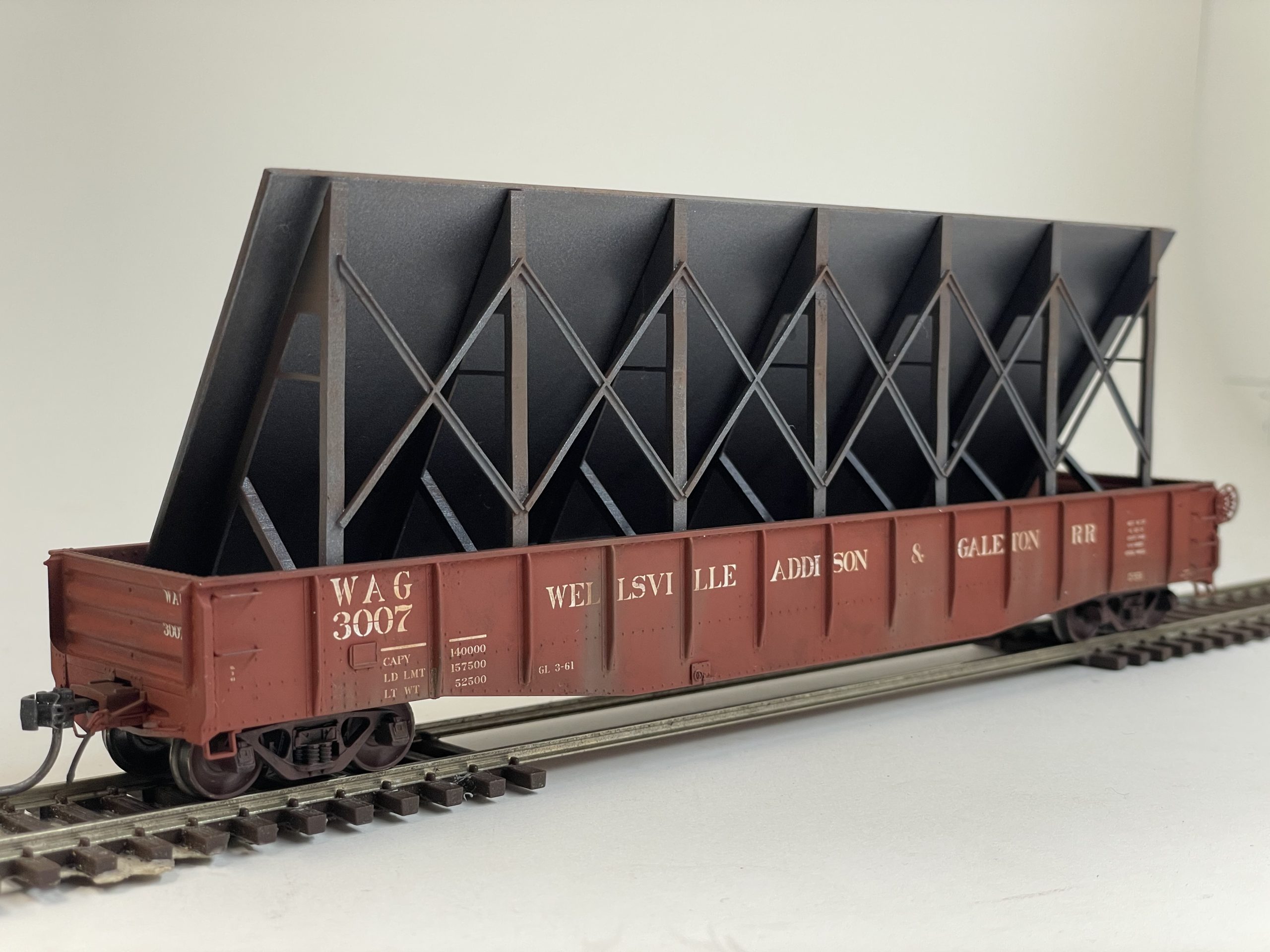When the railroads are needed to transport plate steel over 10′ wide, a rack is used inside a gondola, and the plate is carried at an angle. These racks are capable of carrying up to 16′ wide plate. Designed to fit gondolas with an actual inside width of 1.5″ (Tangent, ConCor, P2K, etc.). Racks would be bolted to the floor of the gondola, and as such, NBW detail is featured in the C Channel bases. All materials are as prototype, and are at, or near prototype dimensions.
